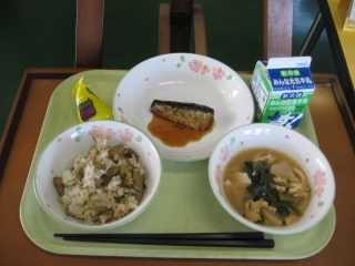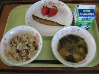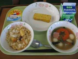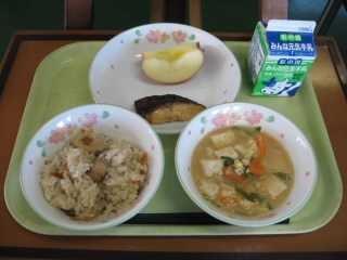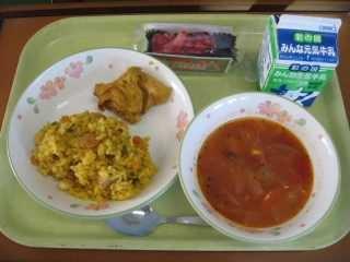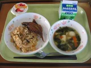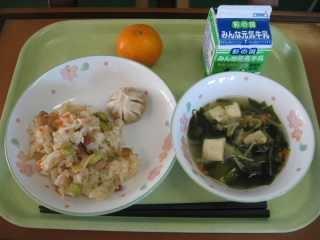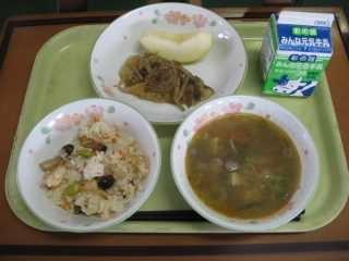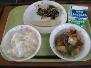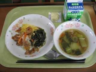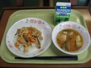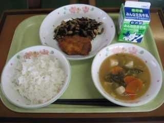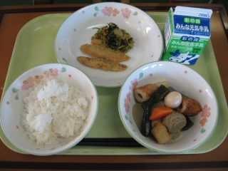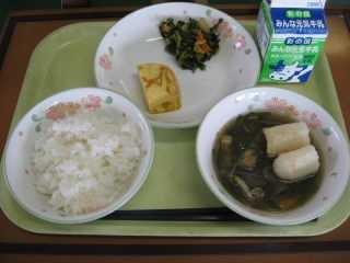 「きりたんぽ」は秋田県の代表的な郷土料理です。もともとはは、木こりたちが山作業の時に、残ったごはんを棒に巻き付けてみそをつけて食べたとか、そのごはんを山鳥やきのこなどといっしょに煮込んで食べたのが始まりとされています。「たんぽ」とは炊いたごはんを多少米粒が残る程度までつぶし、木製の棒に巻き付け、囲炉裏の火であぶったものです。ごはんでできた竹輪のようなものです。昔、槍の刃のカバーの「たんぽ」に形が似ていることからこの名前が付きました。給食では「きりたんぽ汁」として提供します。今日はたんぽが別に配缶されているので、食べる時におつゆに入れてください。鶏肉、にんじん、ごぼう、しめじ、油揚げ、ねぎなどたくさんの食材が使われていて、栄養満点です。身体もよく温まります。