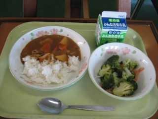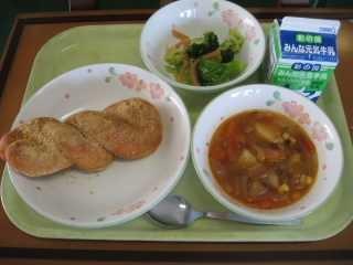 今日はみなさんが大好きな揚げパン!なぜ今日の揚げパンはきなこなのでしょうか?問題です。きなこは何からできているでしょうか?(1)きなこはきなこ(2)黄色い小麦(3)大豆 正解は簡単ですよね(3)大豆です。きなこは、大豆を煎った後に挽いて粉にした食品です。風味豊かで、良質のたんぱくしつや脂質、ビタミンB1、B2に富む栄養満点の食品です。黄色系の大豆を原料とした黄色ののきなこと、緑色系の大豆を用いた淡緑色の青きなこがあります。青きなこは、うぐいす粉ともよばれます。きなこは、餅に絡めたり、和菓子の材料として用いられます。2月は節分がありましたよね。豆まきに大豆を使いましたよね。なので今日も大豆を使ったきなこ揚げパンにしました。栄養いっぱいのきなこをきれいに食べてください。