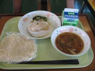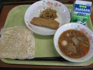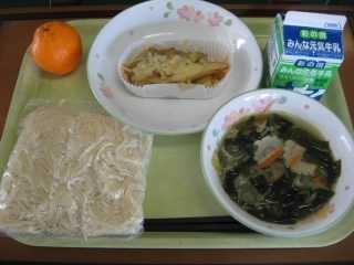 今日は給食初登場のわかめラーメンです。実は鴻巣市の小学校ではわかめうどんはあったけれど、わかめラーメンはありませんでした。しかし、毎年田間宮小の行っているリクエスト給食の調査票に「わかめラーメン」と書く人がちらほらいたので、鴻巣市の献立作成会議にその旨を話して、新メニューとして提案したところ見事に採用され、2月はどこの学校でもわかめラーメンを食べることになりました。このようにみなさんの意見が田間宮小だけでなく鴻巣市内の小学校にも生かされるので、みなさんも普段から、料理に関心を持ってメニューを提案してくださいね。
