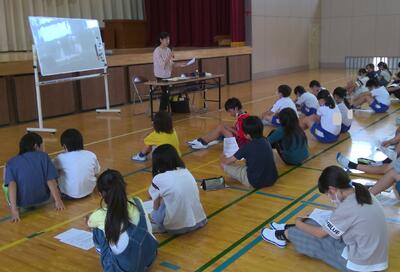 総合的な学習の時間「すてきがいっぱい」の単元の中の日本の文化にふれる活動として、来週いけばな体験を行います。今日は、ゲストティーチャーより、いけばなの起源やいけばなの歴史、いけばなの形などについてご講義いただきました。