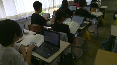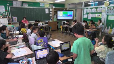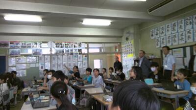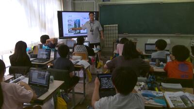5年理科では、「台風は弱くなって消えるのはなぜだろう?」という課題について、各自が予想をPCに打ち込み、先生が大型提示装置でその問いの解決のため説明していました。