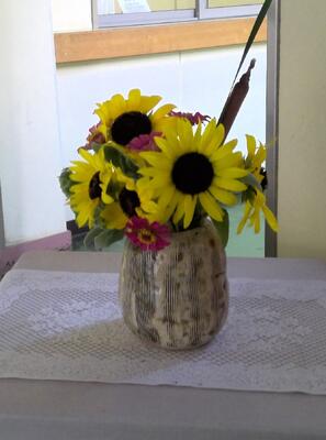 安全ボランティアをしてくださっている近所の方から、今日もお花を届けていただきました。ご自分で育てられている季節のお花を新聞紙にくるんで、早朝学校の玄関に届けてくださいます。大変有難いことです。届けていただいたお花を、本校職員が花器に活け、校内に飾らせていただいています。
