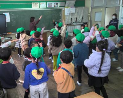 今日は、来年度本校へ入学するお子さんと保護者の皆さんにご来校いただきました。来年度、本校に入学する子たちは、保護者の方々が体育館でお話を聞いたりお迎え当番表を作成したりしている間、1年教室で現1年生と交流していました。