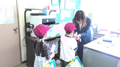 1年生は、生活科の学習として学校探検を行いました。国語の「どうぞよろしく」という自己紹介をする学習も加え、1人ずつ自己紹介カードをつくりました。それには、自分の名前と好きなものが書いてあり、「〇年〇組の 〇〇です。好きなものは、〇〇です。」と1人ずつきちんと挨拶していました。職員室、校長室、保健室を訪れました。「好きなものは、クロミちゃんです。」とか、「好きなものは、〇〇先生です。」と真顔で担任の先生の名前を言う子。とても可愛い1年生でした。
